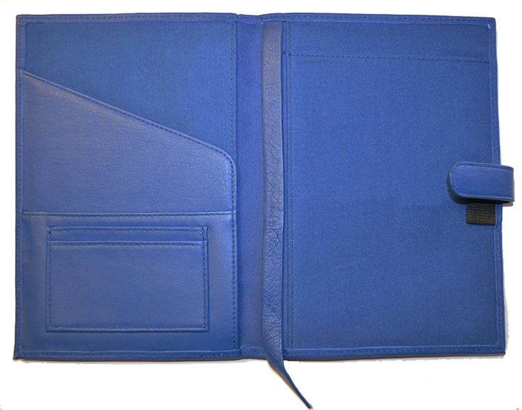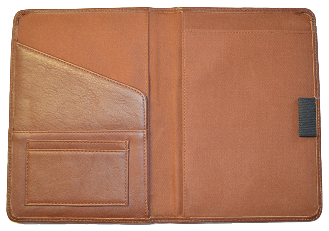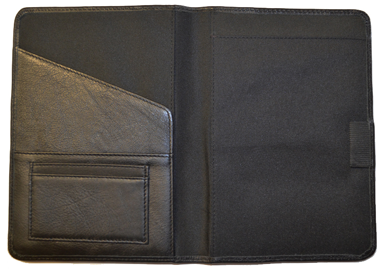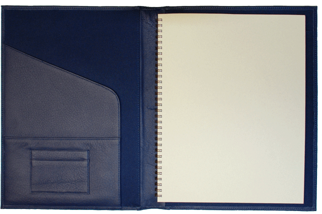 Features: Genuine leather covers. Covers are completely hand stitched and turned edges and foam-padded. Inside has a document flap and business card pockets. Holds an 8 1/2" x 11" notebook or letter size pad, with both vertical and horizontal slots on the right side. Wirebound notebook with 160 ruled pages included.