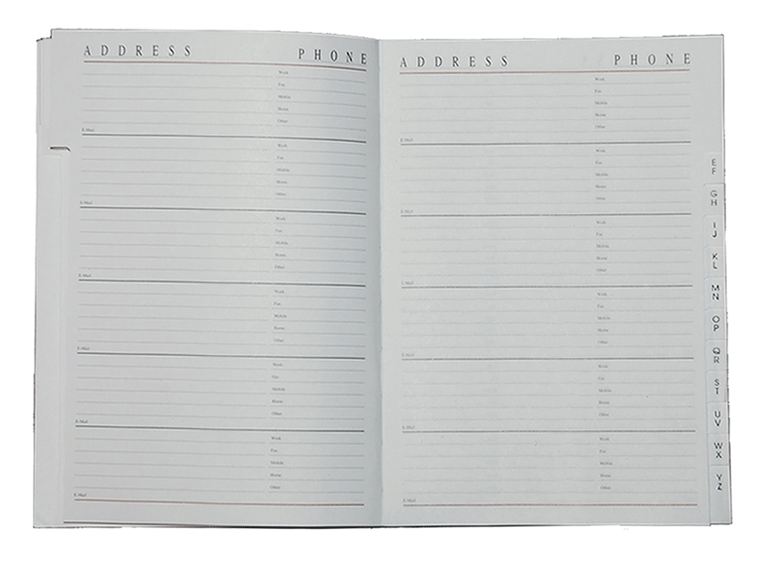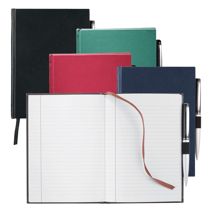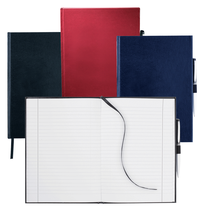 Product Info: These large hardcover notebooks come with 320 numbered pages, a table of contents, and an address book. The notebook pages are printed in 1 color – gray.