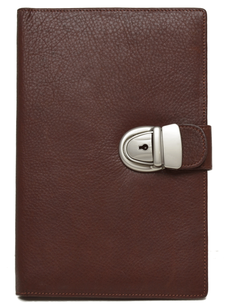Features: Leather notebook has a lock with key. A ruled or blank wire bound notebook (160 pages) is included.