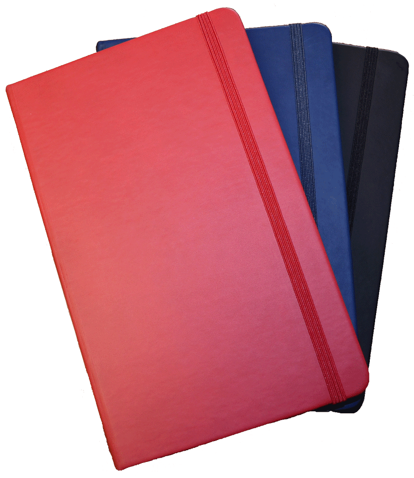 - Lay-flat sewn bound notebook with 240 ruled cream pages (5" x 8" paper).